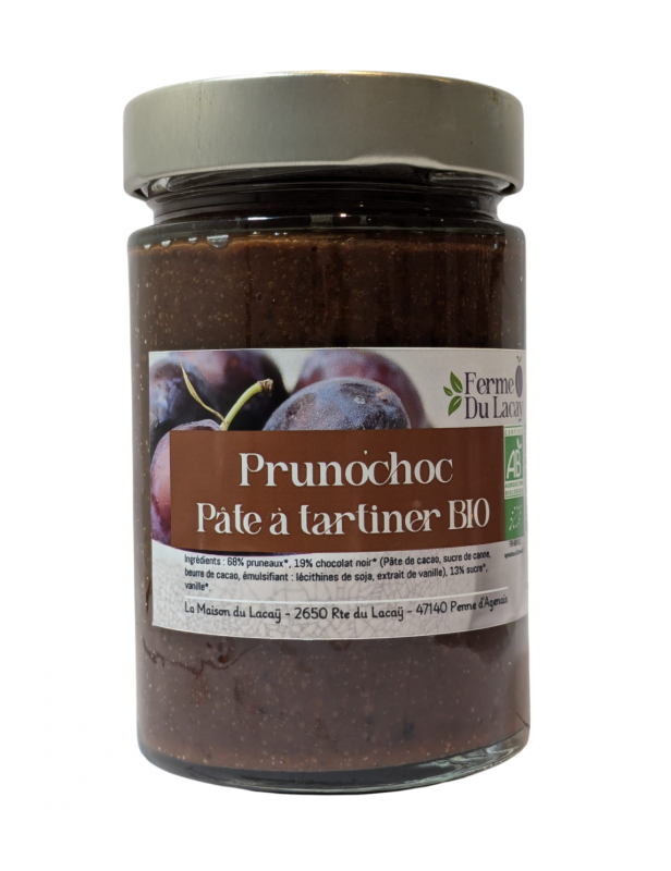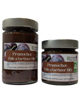 Découvrez le Pruno'choc, une pâte à tartiner alliant la douceur des pruneaux bio de notre ferme et l'intensité du chocolat noir bio certifié par Ecocert.